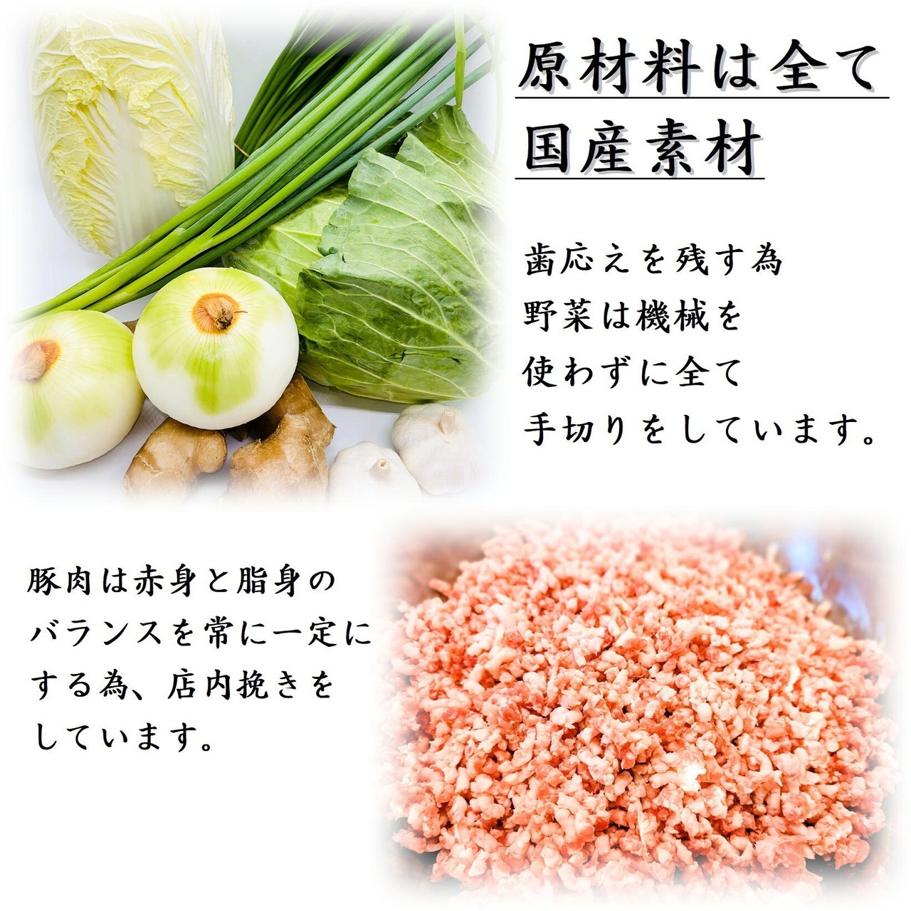 - キャベツ(国産)、豚肉、白菜、ねぎ、玉葱、ニラ、生姜、にんにく、醬油、カキエキス、酒、ごま油、食塩、砂糖、胡椒、かつおエキス、アミノ酸等/